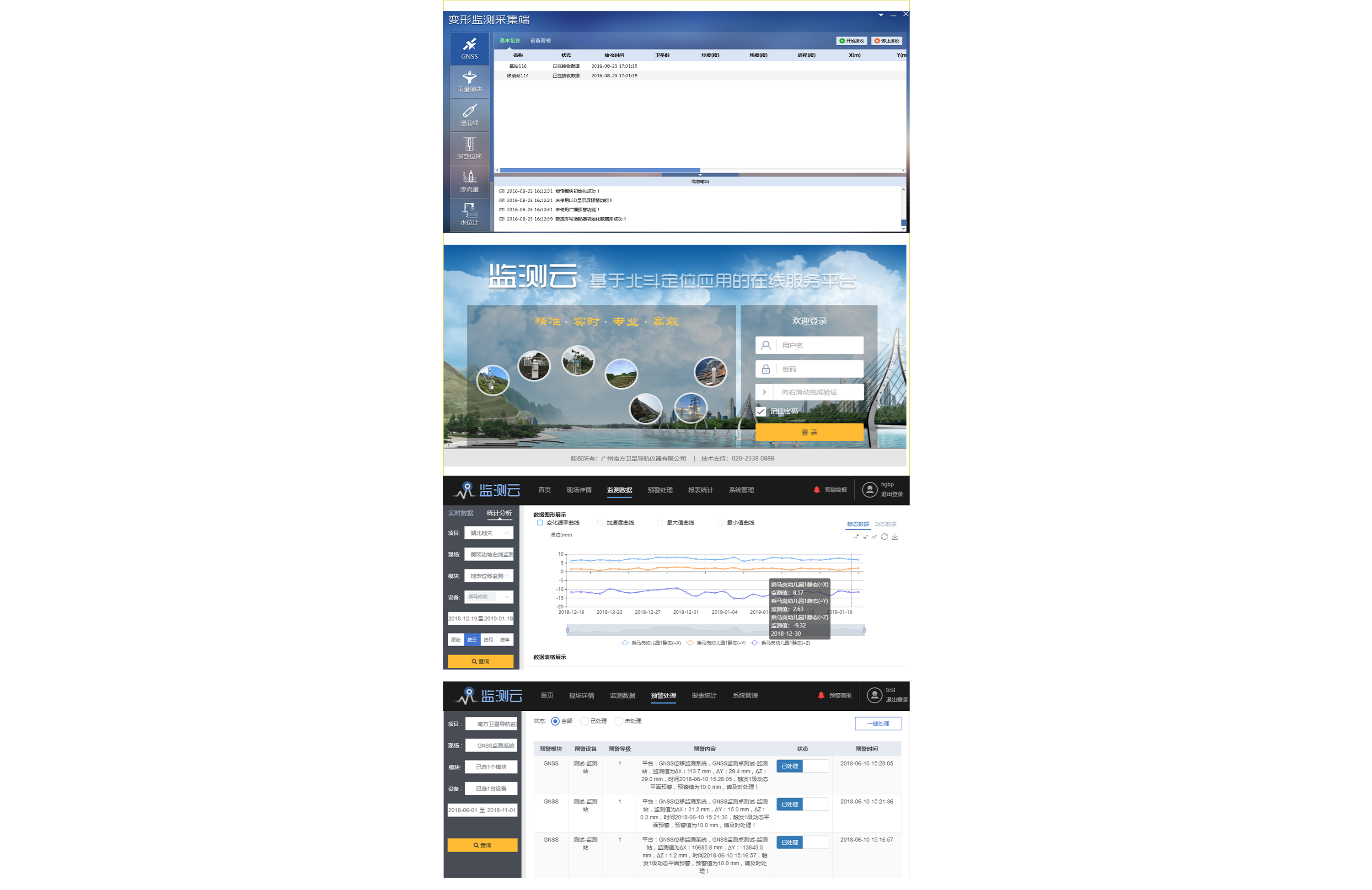 9、在靜態(tài)解算的同時,軟件要能保持實時秒級的坐標輸出,實現(xiàn)mm級靜態(tài)監(jiān)測和實時動態(tài)cm級監(jiān)測雙模式,既能保證監(jiān)測靜態(tài)解算的mm級精度需求,又能通過動態(tài)監(jiān)測模式及時反映監(jiān)測現(xiàn)場的安全狀況,能在第一時刻感知到危害的產(chǎn)生;